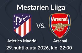 Atletico vs Arsenal pelataan 29. huhtikuuta 2026 Madridissa. Kyseessä on Mestarien liigan välierävaihe.