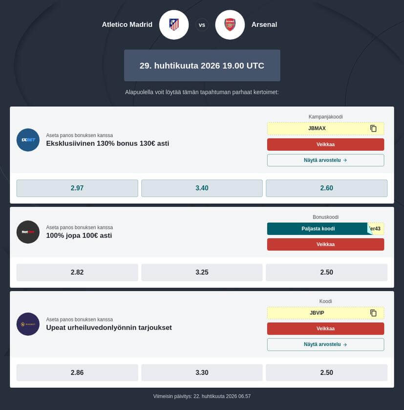 Atletico vs Arsenal vedonlyöntivihjeet kiinnostavat vedonlyöjiä erityisesti ottelun tiukkuuden takia. Joukkueet kohtaavat UEFA Champions League -välierissä vaiheessa, jossa marginaalit ovat erittäin pienet. Vedonlyöntimarkkinoiden mukaan Arsenal tulee otteluun pienenä ennakkosuosikkina kertoimilla 2.40–2.60. Atleticon kertoimet puolestaan pyörivät 2.70 ja 2.90 välillä ja tasapelin 3.30 ja 3.40 välillä. Käydään seuraavaksi läpi tätä ottelua tarkemmin ja analysoidaan sitä vedonlyönnin näkökulmasta.