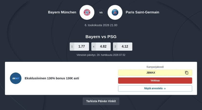 Tässä ottelussa skenaarioajattelu on keskeisessä roolissa. Jos uskoo Bayernin hallitsevan peliä, sen puolelle pelaaminen varmistetuilla vedoilla on loogista. Toisaalta PSG:n vastahyökkäykset tekevät siitä vaarallisen koko ottelun ajan. Tämä lisää epävarmuutta lopputuloksesta.